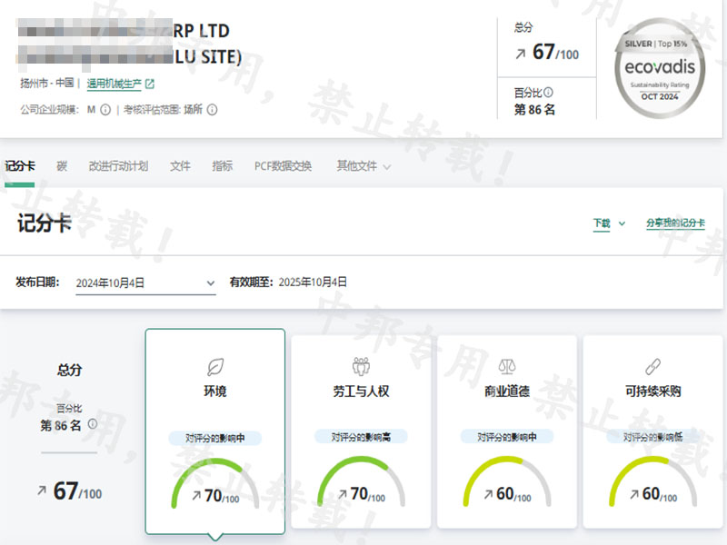 恭贺XX集团股份有限公司2024年11月顺利通过EcoVadis验厂 获得银牌一枚!