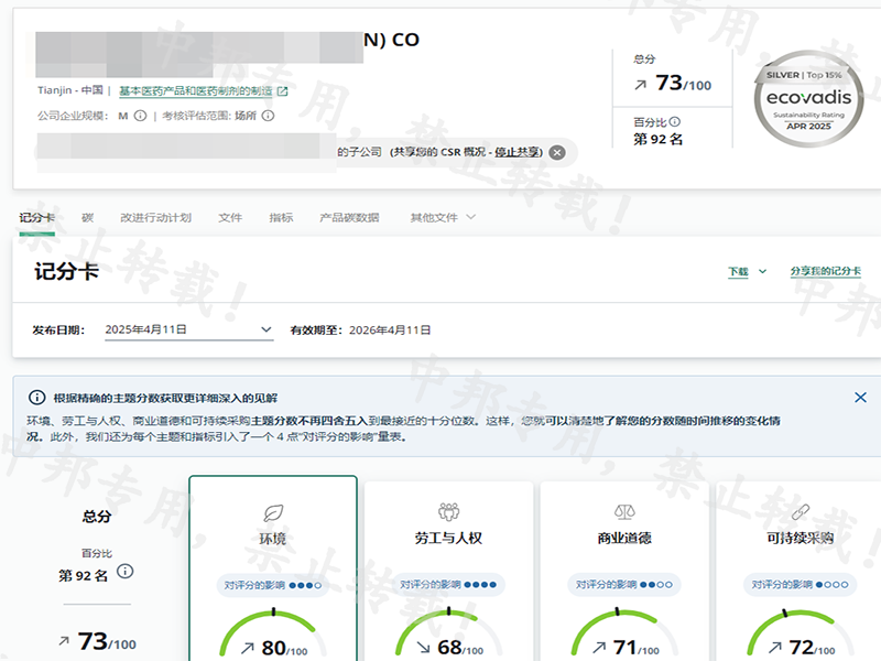 恭贺XX生命科学技术(天津)有限公司2025年4月顺利通过EcoVadis验厂 M型 获得73分银牌!